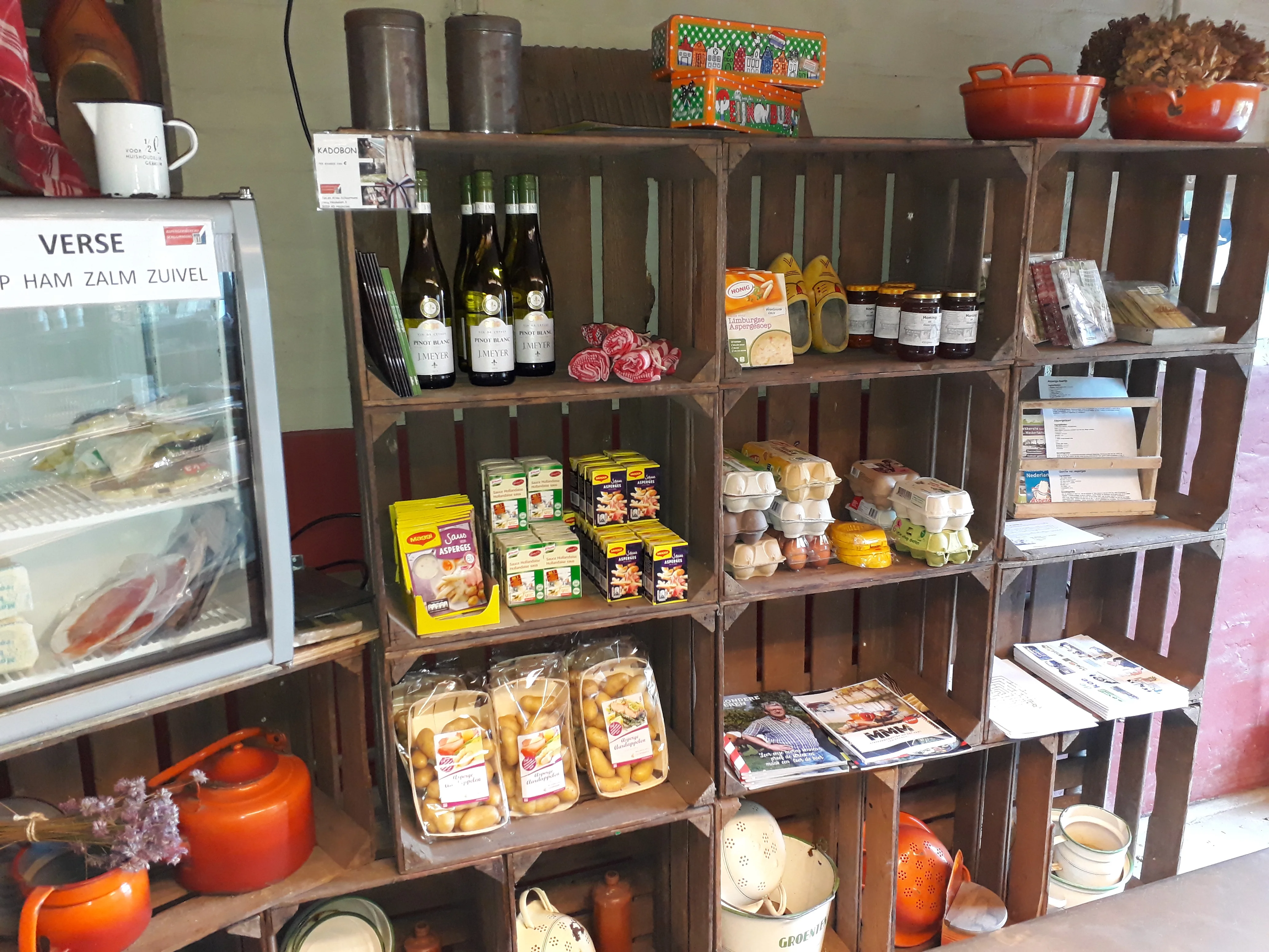 Van april tot eind juni is er een seizoensgebonden aspergewinkel. Dagelijks vers gestoken asperges met een heleboel bijproducten, eieren, ham, roomboter, wijn etc. Zowel tijdens als na het seizoen is er een wisselend aanbod van producten uit de buurt in de boerderij automaat, waar u tevens terecht kunt voor een boek uit onze minibieb.