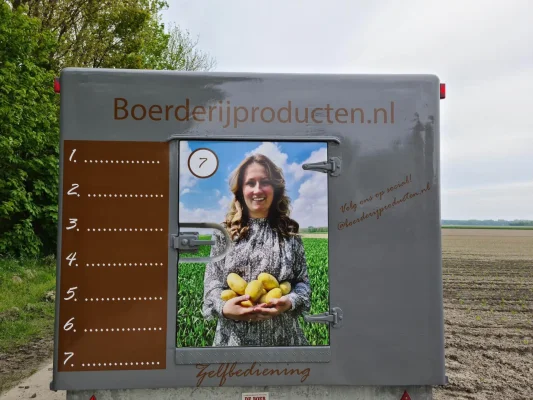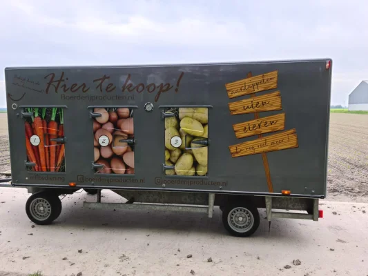 Inmiddels 25 jaar later hebben wij besloten om weer te beginnen met de verkoop aan huis van onze eigen boerderijproducten! Wij hebben een koelaanhanger aangeschaft waardoor onze producten altijd koel, droog en donker bewaard kunnen worden. Op dit moment verkopen wij aardappels, uien en eieren. Maar wij zijn bezig met het uitbreiden van ons assortiment. Het is volledig zelfbediening, maar heeft u hulp nodig staat er altijd iemand voor u klaar om te helpen. De aanhanger staat van maandag tot zaterdag van 08:00 tot 20:00 aan de weg en op zondag van 10:00 tot 20:00. Er is mogelijkheid tot contante betalingen (gepast), en u kunt betalen door middel van het scannen van een QR code op uw telefoon.
