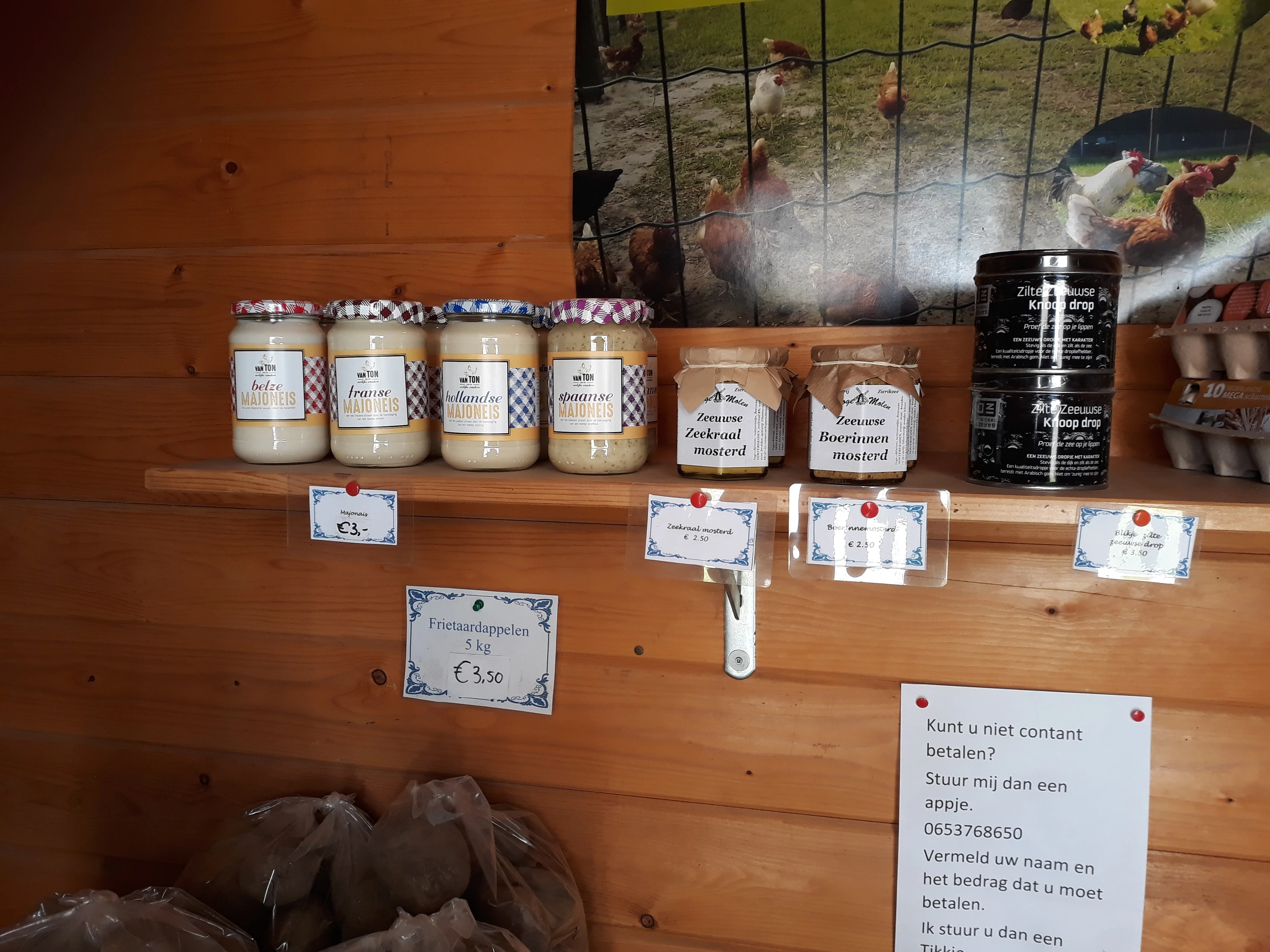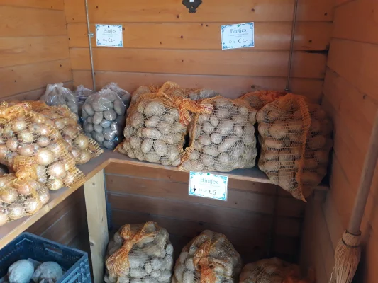 Verkoop van diverse soorten aardappelen, uien ,eieren en streekproducten. Tijdens de coronacrisis is er alleen verkoop vanuit onze zelfbediening. Er is wisselgeld aanwezig. Betalen met een Tikkie is ook mogelijk.