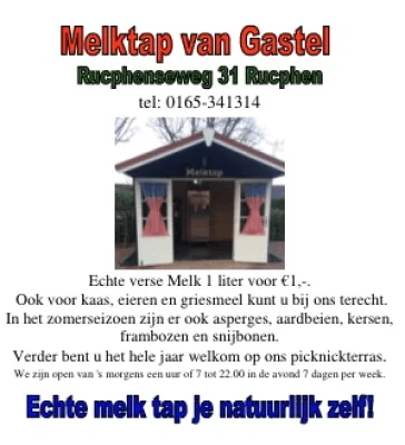 We hebben melk-eieren-kaas het hele jaar door. Aardbeien-asperges-kersen-frambozen-en overige groenten zijn alleen in het seizoen verkrijgbaar. Onze heerlijke melk is rauwe melk dus niet bewerkt. De prijs is 1 euro de liter. (0.50 cent voor een halve liter) U kunt tot 5 liter in een keer tappen. Er zijn herbruikbare glazen flessen in de automaat (links of rechts) te koop voor 1 euro. Hier zit geen statiegeld op.